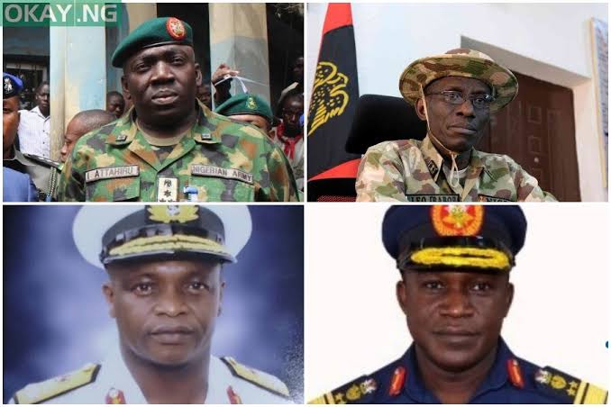Those involved are the Chief of Defence Staff, General Abayomi Olonisakin; Chief of Army Staff, Lt-Gen. Tukur Buratai; Chief of Naval Staff, Vice Admiral Ibok Ekwe Ibas; and Chief of Air Staff, Air Marshal Sadique Abubakar.