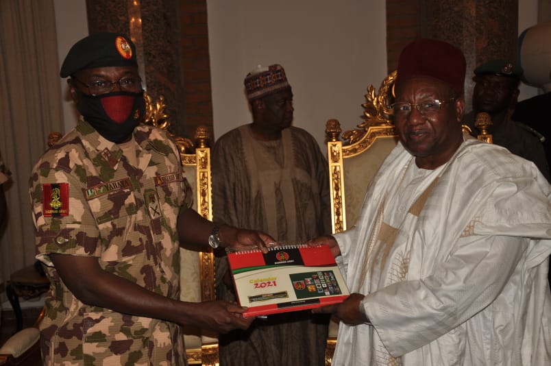 The COAS was accompanied to the palace by the Chief of Operations (Army) Major General Ibrahim Yusuf, other Principal Staff Officers at the Army Headquarters, Theatre Commander, Operation HADIN KAI, Major General Christopher Musa, Acting General Officer Commanding (GOC) 7 Division and Commander, Sector 1 Operation HADIN KAI, Brigadier General Abdulwahab Eyitayo and other senior officers.